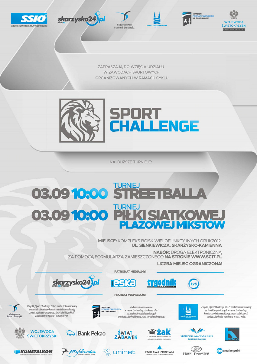 Projekt „Sport Challenge 2017” został dofinansowany ze środków publicznych w ramach otwartego konkursu ofert na realizację zadań publicznych Powiatu Skarżyskiego w 2017 r. w zakresie sportu.
